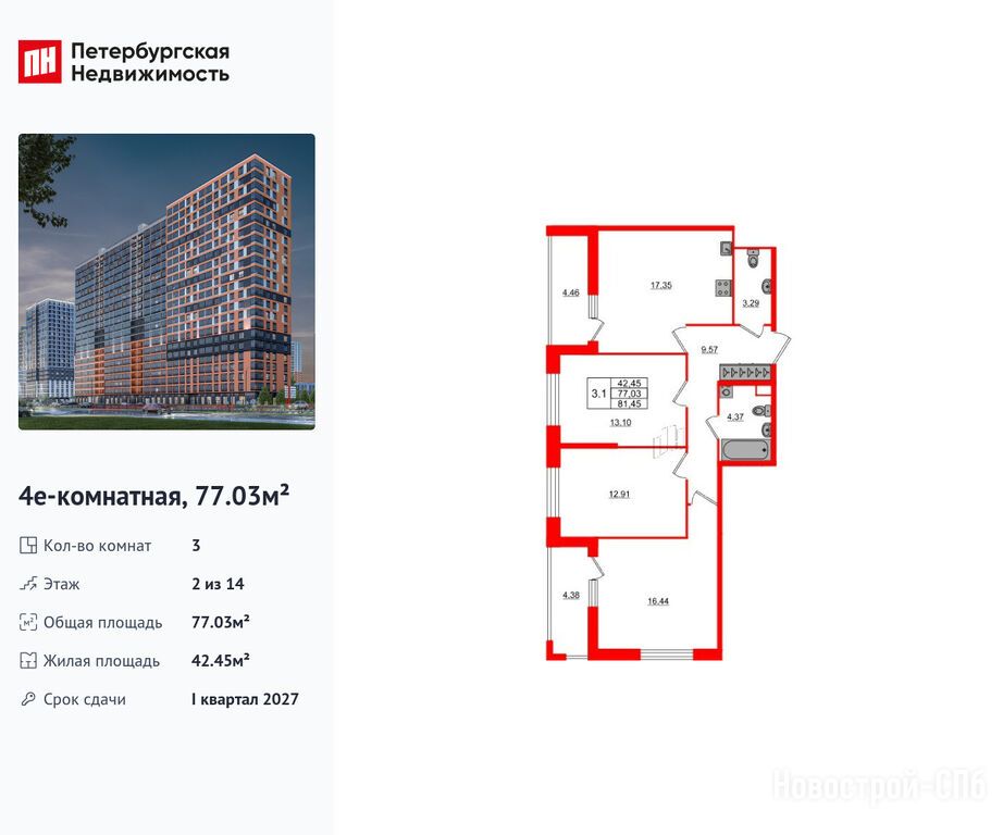 Продается трехкомнатная квартира в новостройке ЖК «Город звёзд» по адресу Ленинградская область, Всеволожский район, Поселок им. Свердлова, Новосаратовка дер., ЖК «Город звезд», корпус 5.1. Общая площадь квартиры - 77.03 кв. м. Тип проекта, по которому построен дом — Монолитно-кирпичный, компания-застройщик — Setl Group (Сэтл Групп). Стоимость квартиры — 13 400 085 руб. Способы оплаты можно уточнить у продавца. Срок сдачи — 1 квартал 2027. Более подробная информация по телефону.