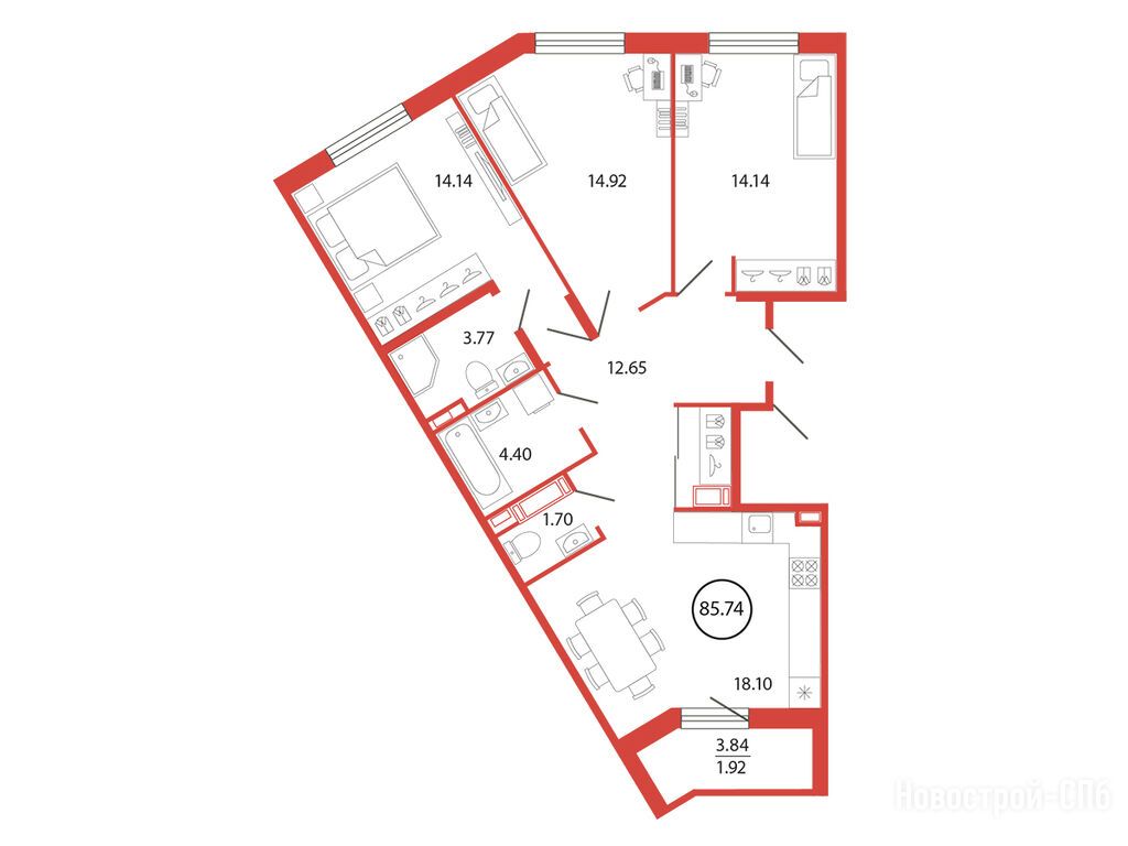 3-комн. квартира, 85.74 м2, 3 этаж
