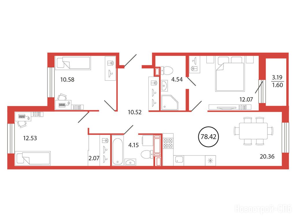 3-комн. квартира, 78.42 м2, 3 этаж