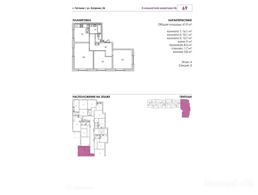 Продается трехкомнатная квартира в новостройке ЖК «Куприн» по адресу Ленинградская область, Гатчинский район, Гатчина, улица Куприна, 26. Общая площадь квартиры - 61.9 кв. м. Тип проекта, по которому построен дом — Панельный, компания-застройщик — СЗ Возрождение. Стоимость квартиры — 7 737 500 руб. Способы оплаты можно уточнить у продавца. Более подробная информация по телефону.