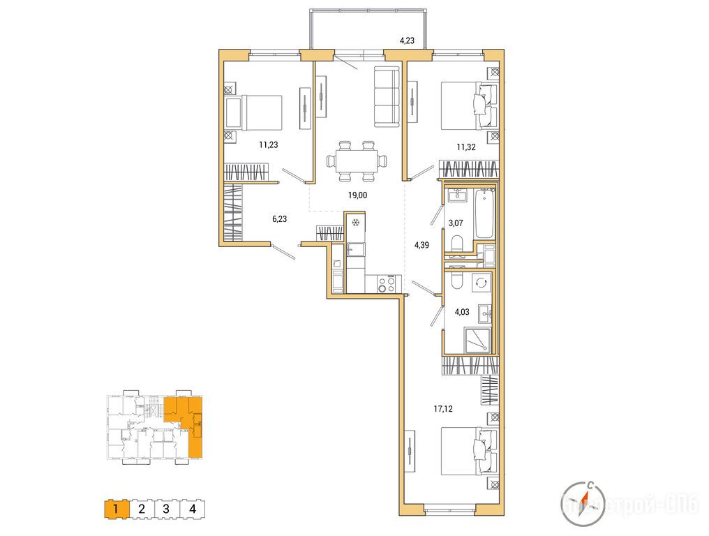 Продается трехкомнатная квартира в новостройке ЖК «ОКЛА» по адресу Санкт-Петербург, Приморский, Суздальское шоссе, 20.. Общая площадь квартиры - 77.66 кв. м. Тип проекта, по которому построен дом — Монолитно-кирпичный, компания-застройщик — «Ленстройтрест». Стоимость квартиры — 19 710 108 руб. Способы оплаты можно уточнить у продавца. Срок сдачи — 1 квартал 2028. Более подробная информация по телефону.