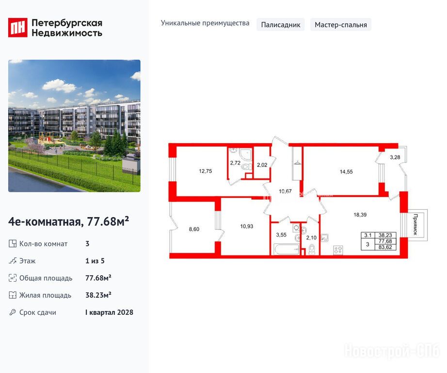 Продается трехкомнатная квартира в новостройке ЖК «Парадный ансамбль» по адресу Санкт-Петербург, Московский, Пулковское шоссе 103Х. Общая площадь квартиры - 77.68 кв. м. Тип проекта, по которому построен дом — Монолитно-кирпичный, компания-застройщик — Setl Group (Сэтл Групп). Стоимость квартиры — 18 100 256 руб. Способы оплаты можно уточнить у продавца. Срок сдачи — 1 квартал 2028. Более подробная информация по телефону.
