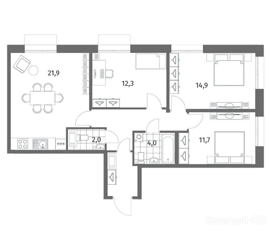 3-комн. квартира 57,40 м2 21 439 000