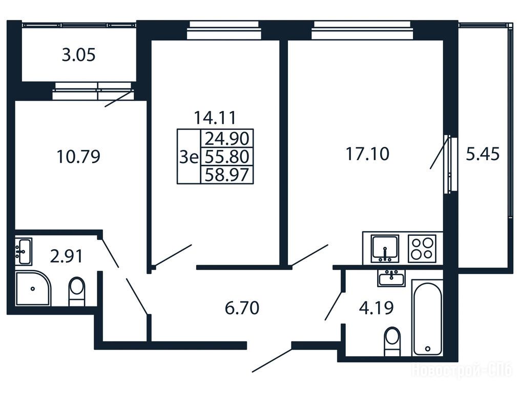 3-комн. квартира, 55.80 м2, 8 этаж