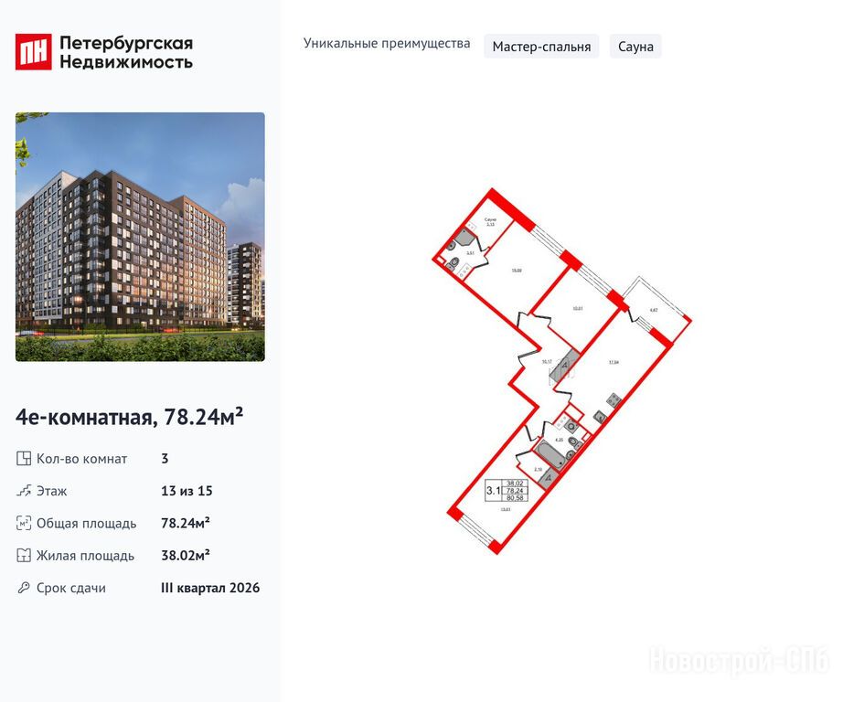 Продается трехкомнатная квартира в новостройке ЖК «Пульс Премьер» по адресу Санкт-Петербург, Невский, Октябрьская набережная. Общая площадь квартиры - 78.24 кв. м. Тип проекта, по которому построен дом — Монолитно-кирпичный, компания-застройщик — Setl Group (Сэтл Групп). Стоимость квартиры — 25 800 227 руб. Способы оплаты можно уточнить у продавца. Срок сдачи — 3 квартал 2026. Более подробная информация по телефону.