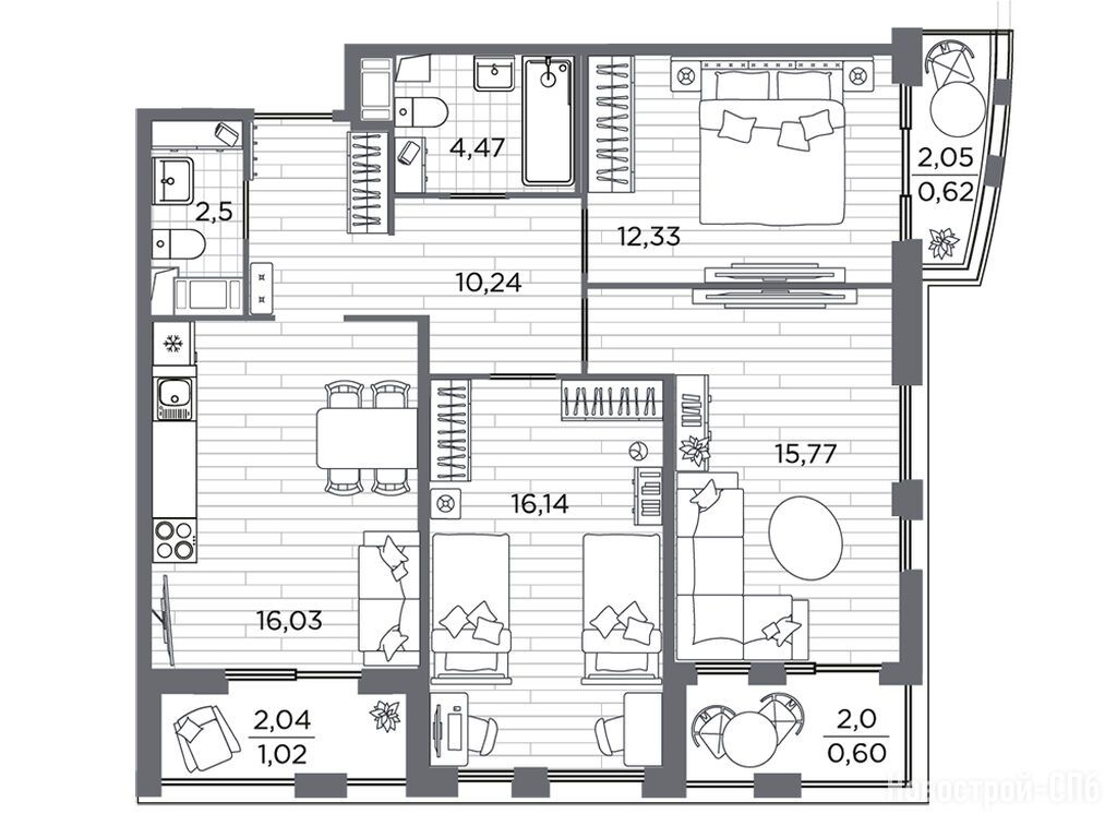 Забронировали трехкомнатную квартиру со светлой отделкой. Два сан узла, балкон, кухня-гостиная почти 19,м2. Понравилась идея с общественными террасами. Там посадят кустарники, обустроят лаунж-зоны, поставят столики, стулья. Можно будет и погулять и поработать