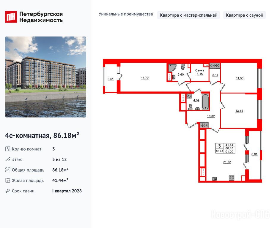 Продается трехкомнатная квартира в новостройке ЖК «Сэтл Ривьера» по адресу Санкт-Петербург, Невский, Октябрьская набережная (корп. 1.1). Общая площадь квартиры - 86.18 кв. м. Тип проекта, по которому построен дом — Монолитно-кирпичный, компания-застройщик — ООО «СЗ ПОТЕНЦИАЛ», Setl Group (Сэтл Групп). Стоимость квартиры — 27 050 135 руб. Способы оплаты можно уточнить у продавца. Срок сдачи — 1 квартал 2028. Более подробная информация по телефону.
