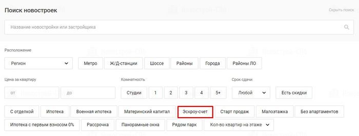 Теперь в форме поиска на Новострой-СПб, выбрав параметр «эскроу-счет», можно отфильтровать все ЖК, в которых квартиры продаются по этой схеме.