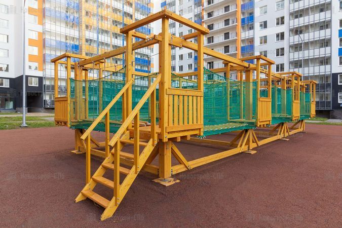 Компания «Строительный трест» проектирует свои детские площадки под каждый конкретный дом. Например, в одном из дворов ЖК NEWПИТЕР установлена площадка в виде пирамиды из нержавеющей стали высотой около 8 метров с закрытыми горками, создана сеть велодорожек, есть тарзанка и площадка из природных материалов. Практически в каждом дворе установлен спортинвентарь и столы для настольного тенниса.