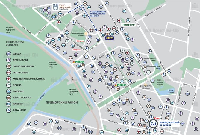 Приморский район отличается хорошо развитой инфраструктурой. Крупных гипермаркетов, торговых центров, всевозможных магазинов, стадионов и спорткомплексов тут в избытке. Но, самое главное – его жителям в принципе хватает поликлиник, школ и детских садов. По крайней мере, молодым родителям не приходится годами стоять в очереди в ожидании места для малыша, а школьники имеют шанс поменять учебное заведение.