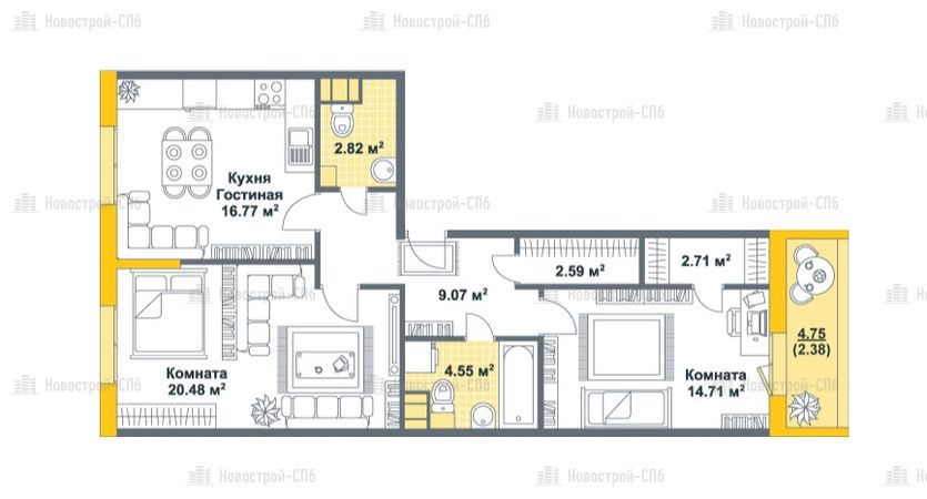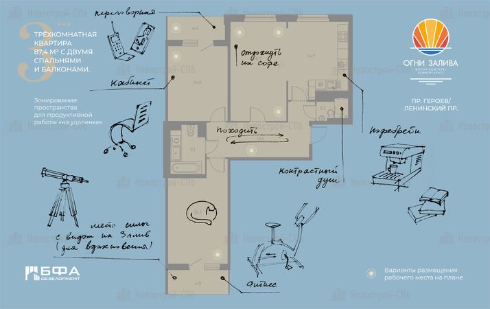 Квартиры в ЖК «Огни залива» отлично подходят для удаленной работы. Ширина комнат составляет от 3,3 м, что легко позволяет их зонировать. Во всех квартирах запроектированы просторные прихожие, а в комнатах большие окна и много света. Предусмотрено множество различных планировочных решений, в том числе, есть лоты с двумя санузлами.