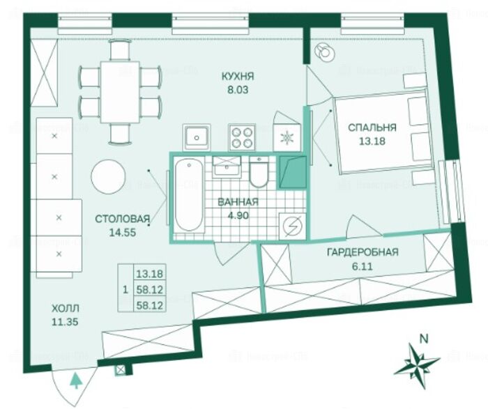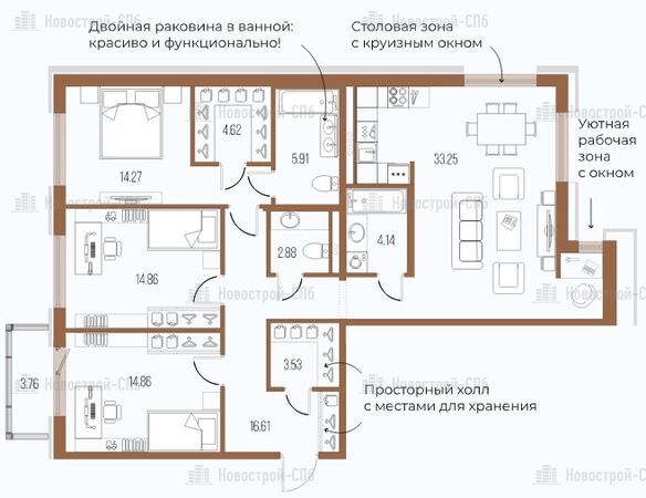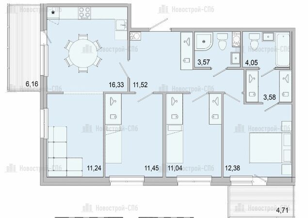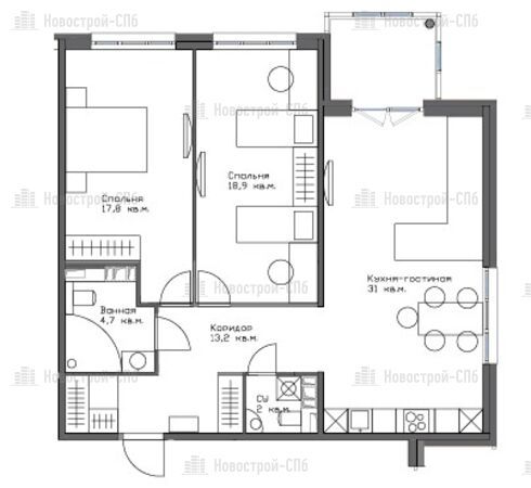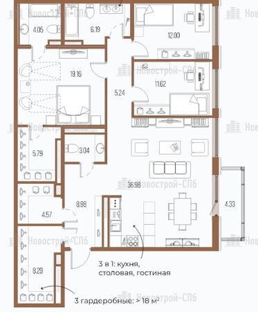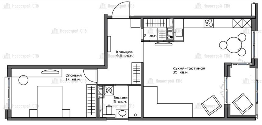 Покупателю предстоит сделать собственный выбор: объединить или разделить кухню с гостиной, площадь которой достигает 35 кв. м. Даже если выделить дополнительную изолированную комнату, то площадь кухни все равно составит от 9 до 15 кв. м. Позже планировка может быть изменена путем возведения или сноса ненесущей перегородки.