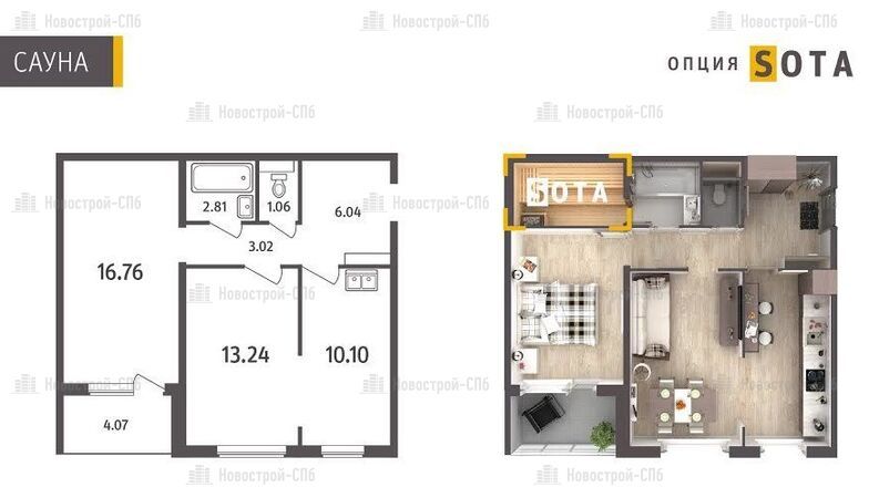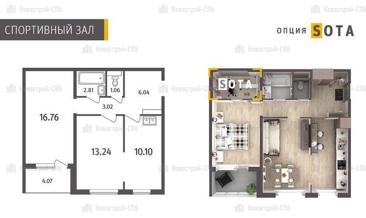 В проектах ГК «Ленстройтрест» есть квартиры-трансформеры с опцией SOTA. Это комната размером около 5-7 кв. м, в которой покупатель может заказать обустройство кабинета, спортзала, кладовой, мастерской или помещения другого функционала. Всего разработано 12 готовых решений. В основе SOTA – инженерное обеспечение. Для каждого из вариантов предусмотрен специализированный набор систем вентиляции, кондиционирования, отопления, электроснабжения и освещения. Все квартиры достаточно компактны, что помогает не переплачивать за лишние метры.