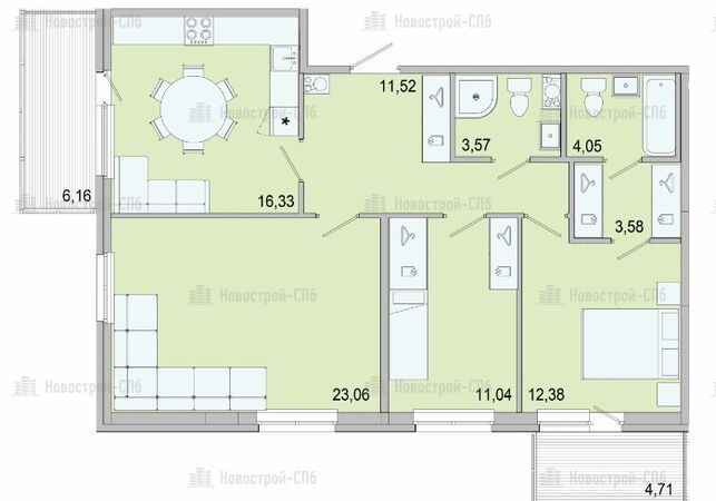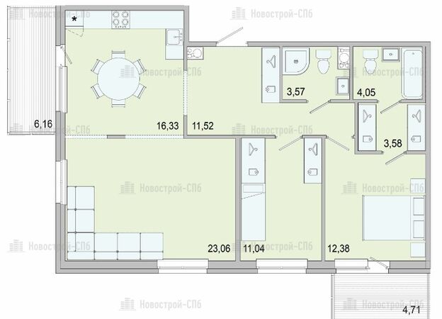 Другой вариант – трехкомнатная квартира в ЖК «Классика. Дом для души». Здесь есть полноценная 35-метровая гостиная с тремя окнами. Помещение кухни отделено. Гостиную можно оставить единым пространством или поделить на меньшее, выделив дополнительную спальню или кабинет.