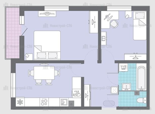 Наряду с базовым вариантом планировки, такое жилье имеет две-три альтернативных модификации. Реализуются они путем изменения конфигурации полноценных внутриквартирных ненесущих перегородок.