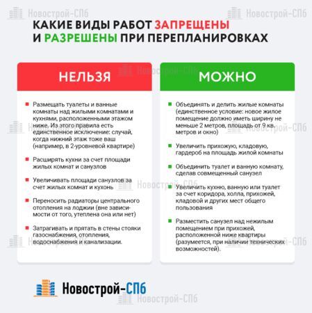 Некоторые мероприятия по перепланировке не получится согласовать ни при каких обстоятельствах, так как они могут повлечь за собой ухудшение условия эксплуатации и проживания в доме, нарушение прочности здания.