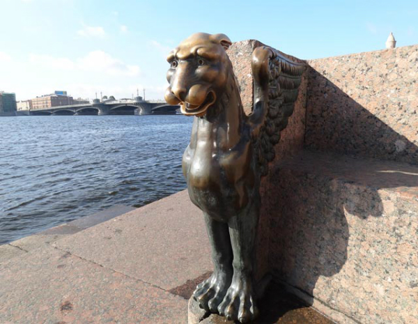 Среди петербуржцев существует предание, что если одну руку положить в пасть грифона, а другой погладить его по голове, загадав при этом самое заветное желание, оно непременно исполнится. Грифоны вообще известны в городе как «мастера удачи». Например, именно они охраняют таинственную Башню, приносящую счастье, во дворе древней аптеки доктора Пеля.