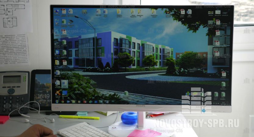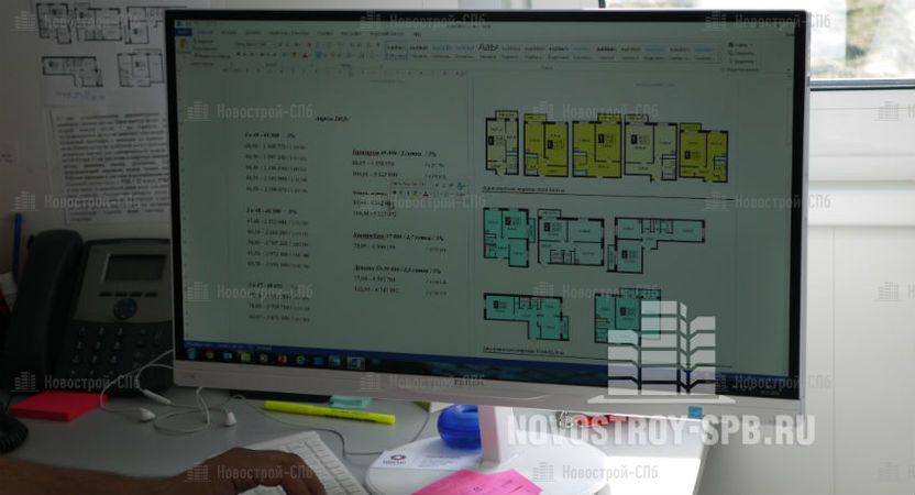 Рассказав обо всем, менеджер пригласил нас в офис продаж, где можно было полистать большие журналы с планировками и посмотреть развешанные на стенах изображения рендеров. Он распечатал и раздал прайс-листы и брошюры с общей информацией о жилом комплексе, после чего попрощался с нами.