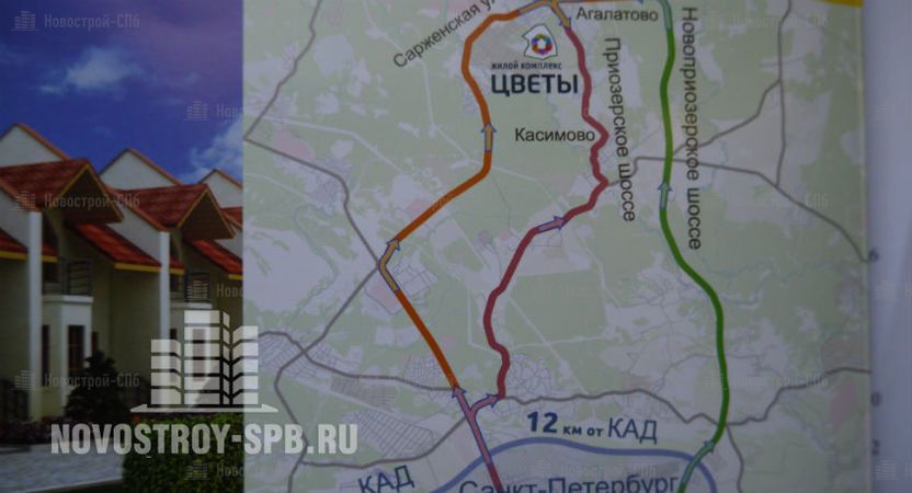 Добраться до новостройки можно тремя путями: по Новоприозерскому шоссе, Приозерскому шоссе и, свернув с Выборгского шоссе на дорогу через Скотное. Мы съехали с КАД на Новоприозерское шоссе, затем повернули на Вартемяги и далее по Приозерскому шоссе доехали до остановки Касимово-2. Через 50 метров мы увидели большой баннер, указывающий на поворот к новостройке (если ехать с противоположной стороны, через Агалатово, баннер также видно).