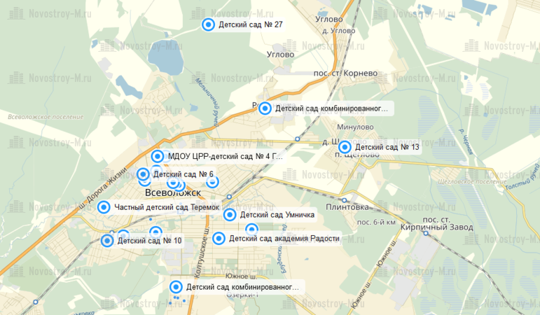 С тем же успехом, можно пользоваться и инфраструктурой города Всеволожск, раз уж речь все равно идет о транспортной доступности. Это достаточно большой город, и все необходимое для жизни там есть: несколько школ и детских садов (правда, они сильно переполнены, и в данный момент проще устроить детей в садик в Щеглово).