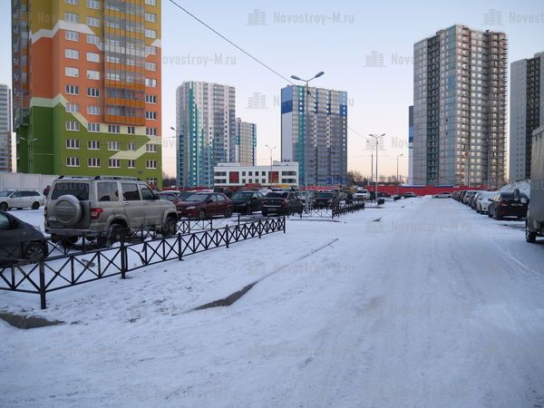 В ЖК «Новая Охта. На речке» сейчас строят первые этажи первых домов, но напротив уже заселенный комплекс «Новая Охта», где достраивают последние дома, так что можно посмотреть застройку на его примере, поскольку в ЖК «Новая Охта. На речке» все будет идентично.