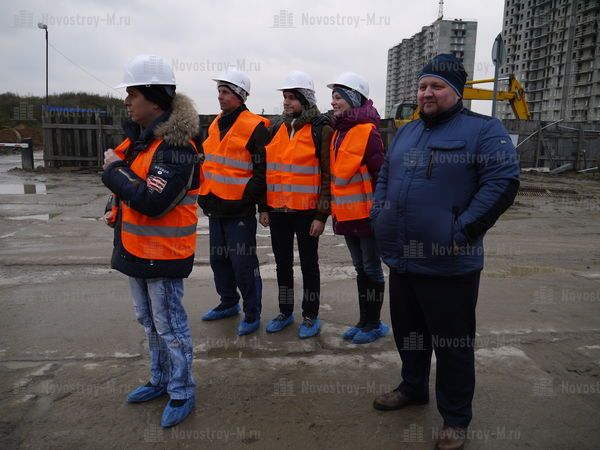 На выходе из автобуса нас встретили представители застройщика, потом в беседке нам выдали сигнальные жилеты, каски и бахилы, а также очень симпатичные сумки с печатными материалами.