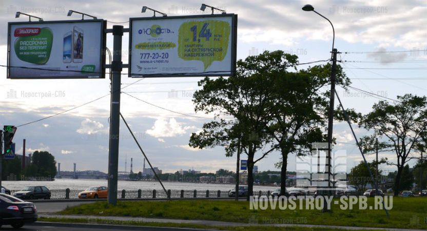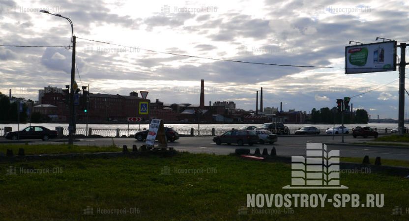 Южнее тянется сад Крупской, но квартиры с юго-западной ориентацией окон уже давно раскуплены. А самое главное – вид на Неву перекрывает нескончаемый поток транспорта, в том числе грузового, который постоянно движется по Октябрьской набережной в 4 ряда днем и ночью.
