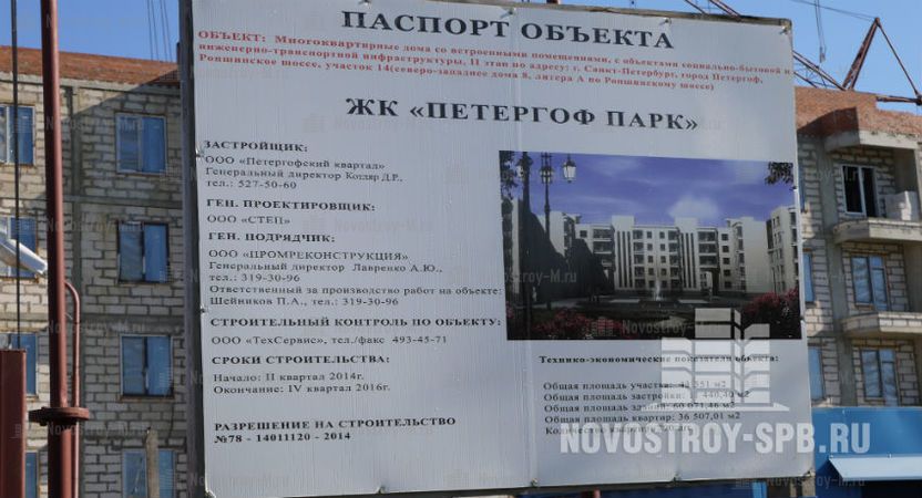В данный момент УК «Теорема» занимается строительством таунхаусов и продажей участков ИЖС, старт продаж квартир в пятиэтажных домах намечен на 2016 год. Помимо УК «Теорема» участок осваивают еще два застройщика: компания «Абсолют Строй Сервис» строит ЖК «Новый Петергоф» (проверен Тайным покупателем), рядом компания PRK-Group возводит ЖК «Петергоф Парк», о котором и пойдет речь в дальнейшем.