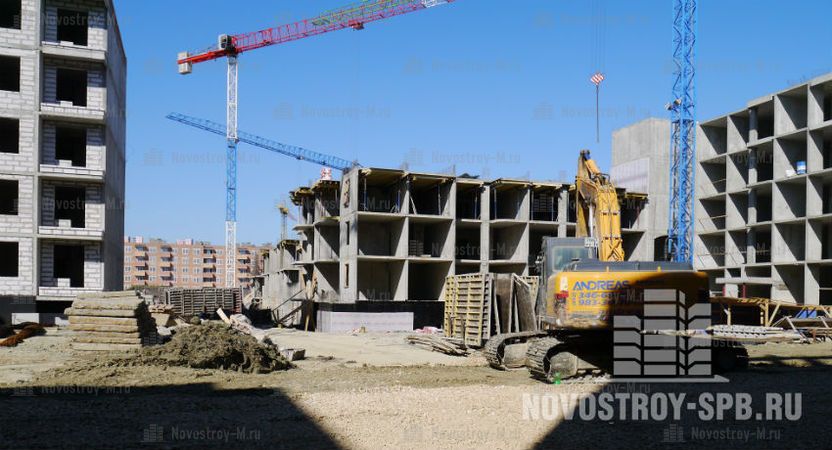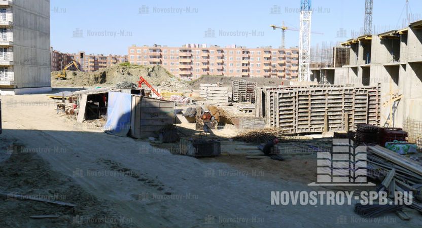 Наибольшую степень готовности сейчас имеет корпус 2.8, корпуса 2.7 и 2.9 также уже подведены под крышу, корпуса 2.3 и 2.6 достроены до 5 этажа, корпус 2.3 до 3 этажа, в 2.1 заливают цоколь, в 2.5 - устраивают фундамент.