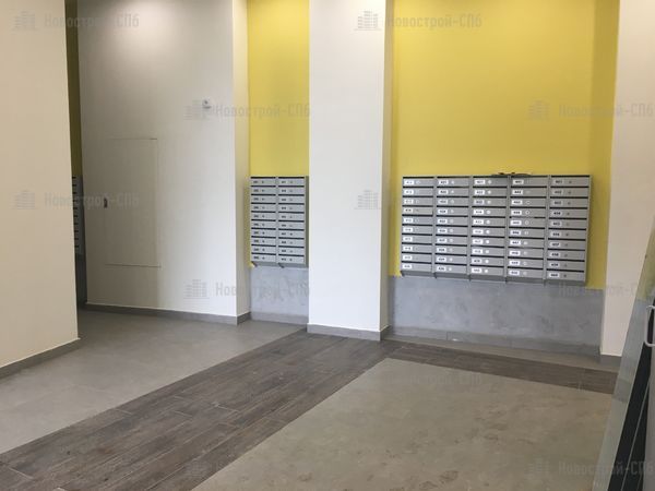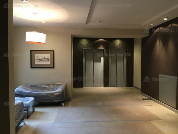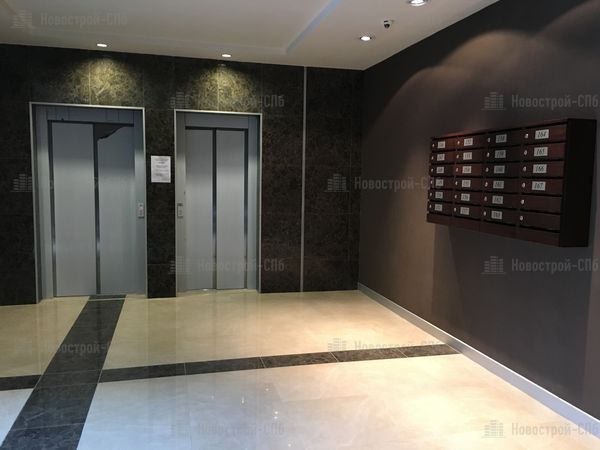 Входные группы выполнены в голубой и охристой палитре, двери сделаны из противоударного стекла. Также, как и в «Четырех горизонтах», предусмотрены зоны ожидания и ресепшен. Лифты установлены фирмы Schindler. Напротив входа на стене – декоративное панно, представляющее из себя репродукцию старинной гравюры с изображением Санкт-Петербурга.