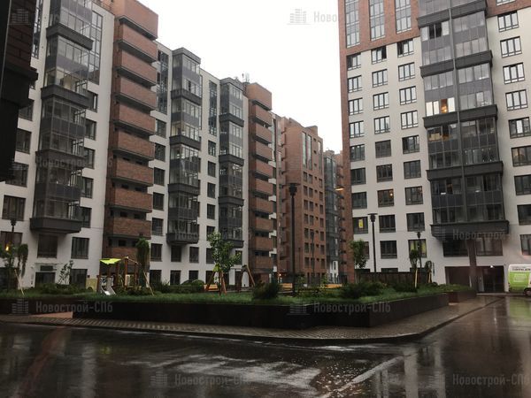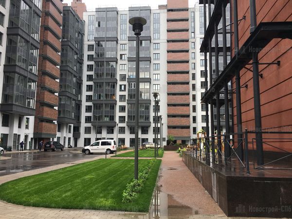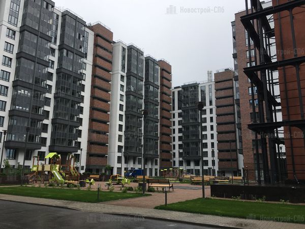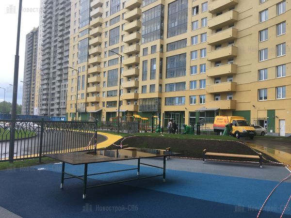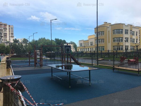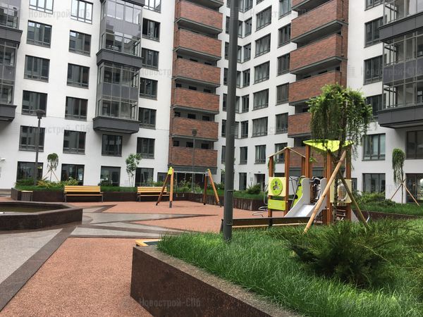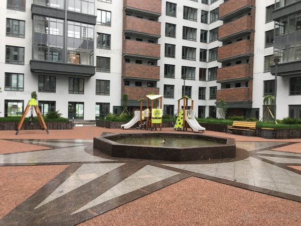 Внутренняя территория ЖК «Дом на излучине Невы» и «Четыре горизонта», на мой взгляд, простовата. Есть современные детские площадки, скамейки, небольшой фонтан, спортивная площадка, но всё выглядит слишком скучно и формально. Дворы мне показались неуютными и слишком строгими.