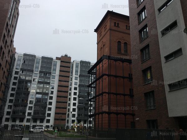 Объединяющей доминантой комплексов является восстановленная водонапорная башня Охтинской бумагопрядильной мануфактуры XIX века. Сама мануфактура находилась на этом месте до 2005 года и в итоге была снесена. Водонапорную башню решили восстановить и использовать не только как декоративный объект, но и под коммунальные нужды.