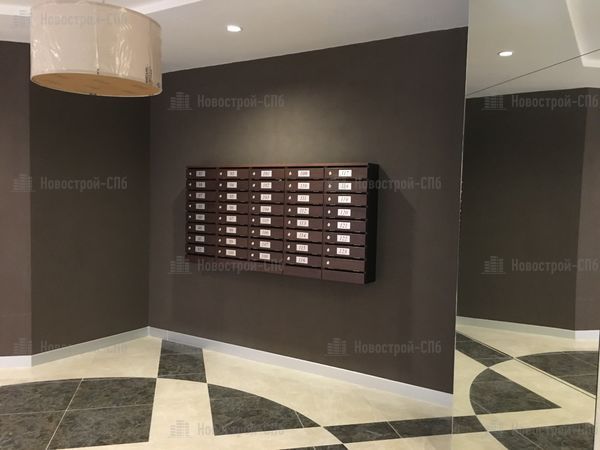 В доме «Четыре горизонта» просторные и светлые входные группы, выполненные в коричнево-бежевой гамме. Главным украшением является настенное панно в виде розы ветров. В лифтовых холлах обустроены зоны ожидания с мягкими диванами. Стены украшены репродукциями гравюр старого Петербурга. Почтовые ящики – деревянные. Двери в парадную изготовлены из противоударного стекла. В рекламном буклете говорится, что в парадных также организована зона ресепшен, где гостей будет встречать консьерж. Но в двух парадных, в которых я побывала, я этого не увидела. Вполне возможно, что ресепшен будет только в одной парадной (главный вход). В доме «Четыре горизонта» установлены бесшумные современные лифты фирмы Schindler по два для каждой секции.