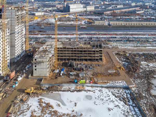 Ближе всего можно подойти к стройплощадке со стороны Мартыновской улицы. Строительный забор оказался невысоким, и просматривалась площадка неплохо, но сами дома было почти не видно из-за большого расстояния до них и малой готовности, а вот стоящие за ними дома ЖК «Граффити» просматривались лучше. Строительство корпуса 3.1 UP-квартала «Комендантский» ведется сейчас на уровне первого этажа: в третьей секции отливают монолит, во второй секции идет армирование стен, в первой закончен цокольный этаж.