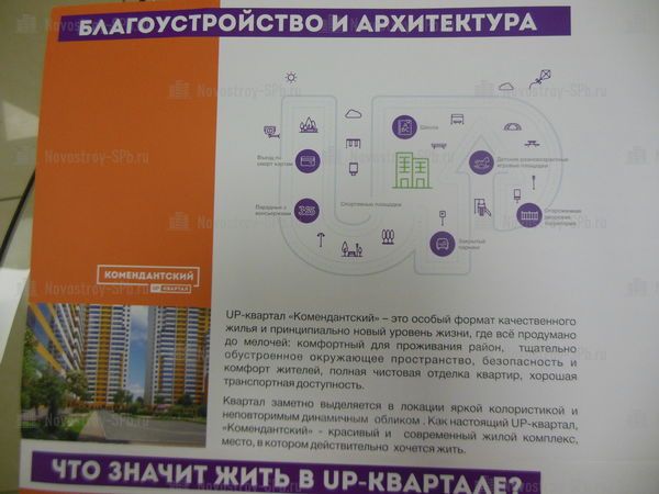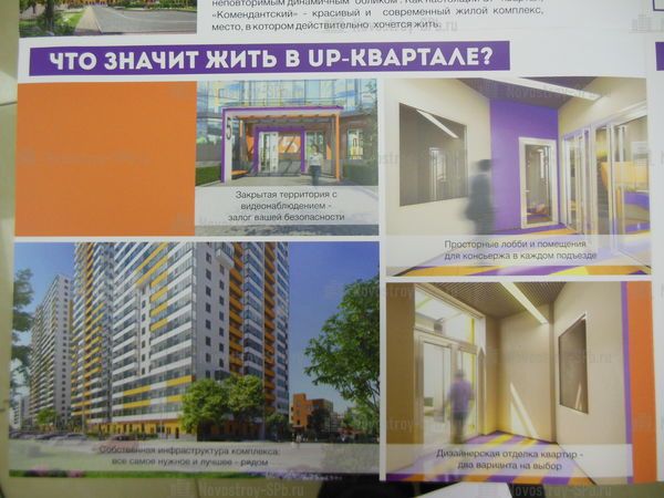UP-квартал «Комендантский» привлекает, в первую очередь, сочетанием цены, удобства локации и уровня комфорта жилья. К преимуществам проекта относится технология строительства, сбалансированная квартирография, небольшое количество квартир на этаже и прочие характеристики комфорт-класса (закрытая охраняемая территория, дизайнерская отделка холлов, консьерж и т.д.). Также в пользу проекта говорит надежность застройщика и тот факт, что квартиры обещают сдать с чистовой отделкой высокого качества.
